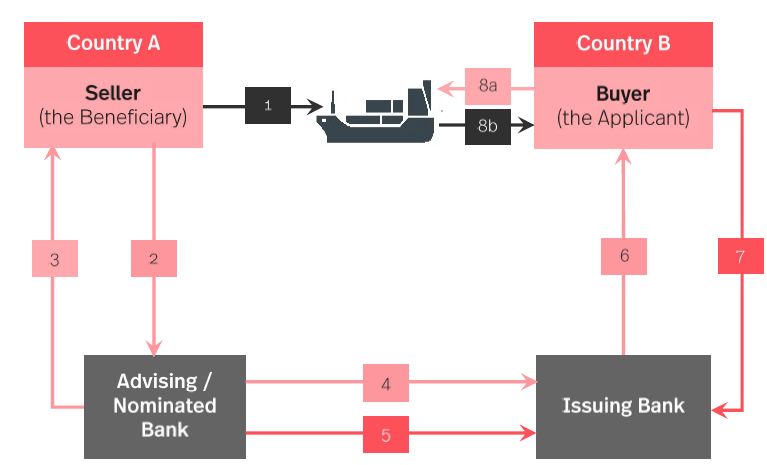 Seller having received confirmation from the Advising Bank that a Letter of Credit has been issued on behalf of the Buyer, then initiates the shipment of goods and places in hands of the Shipper or Carrier.