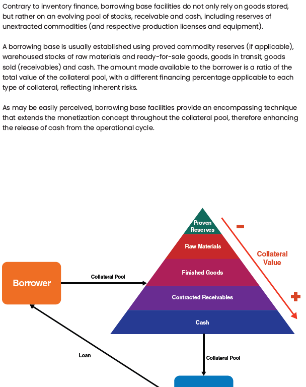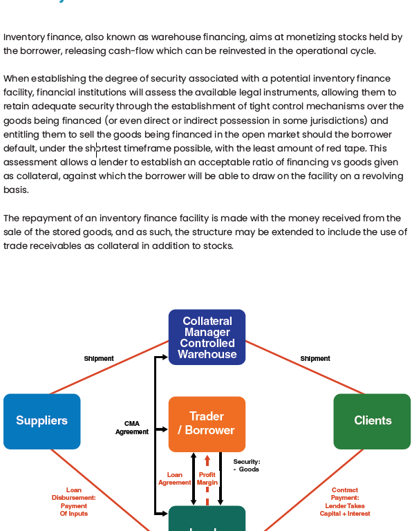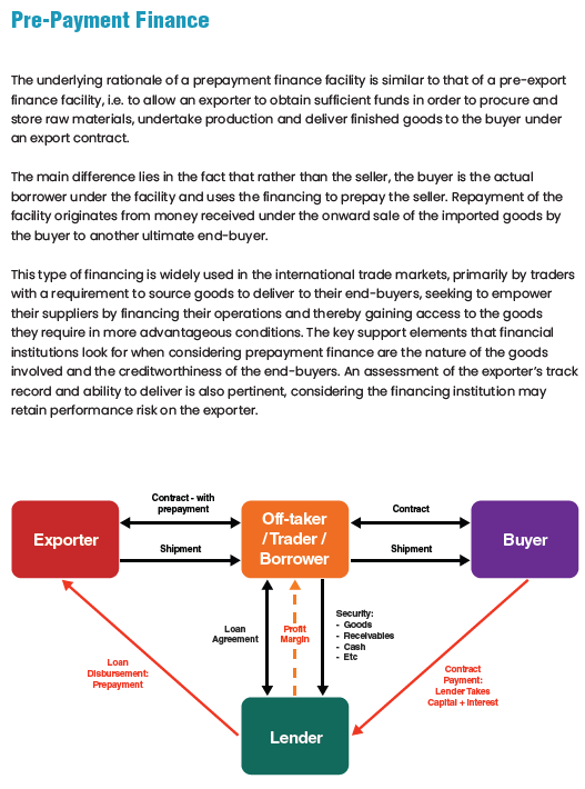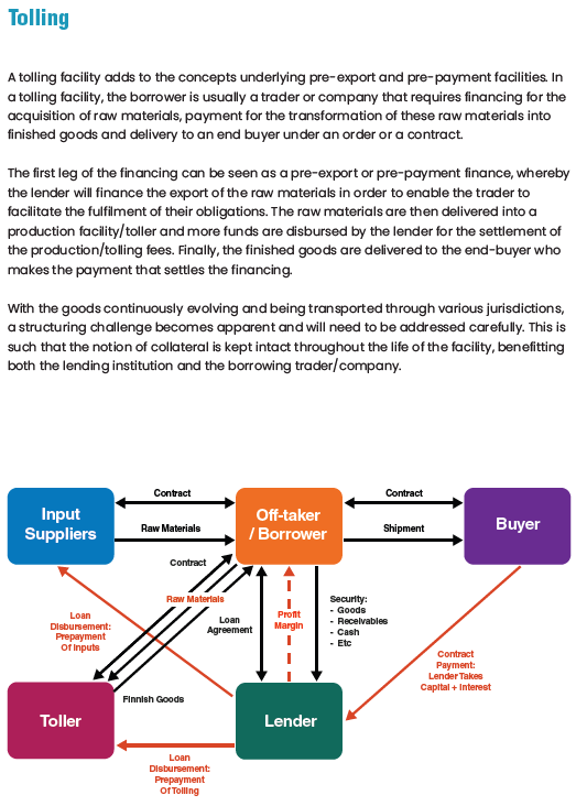 Structured Funded trade finance products are complex trade finance tools focused on the provision of funding and/or credit to participants in the trade transaction. These tools include pre-export finance, prepayment finance, tolling, inventory finance, borrowing based facilities and asset-based lending amongst others.