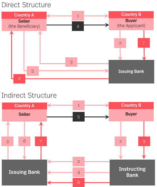 Buyer - known as the Applicant - instructs his bank (the Instructing Bank) to request the Seller's bank (the Issuing Bank) to issue a Demand Guarantee in favour of the Seller as Beneficiary for obligations of Buyer under the Contract of Sale and which the Issuing Bank will be counter-guaranteed by the Instructing Bank.